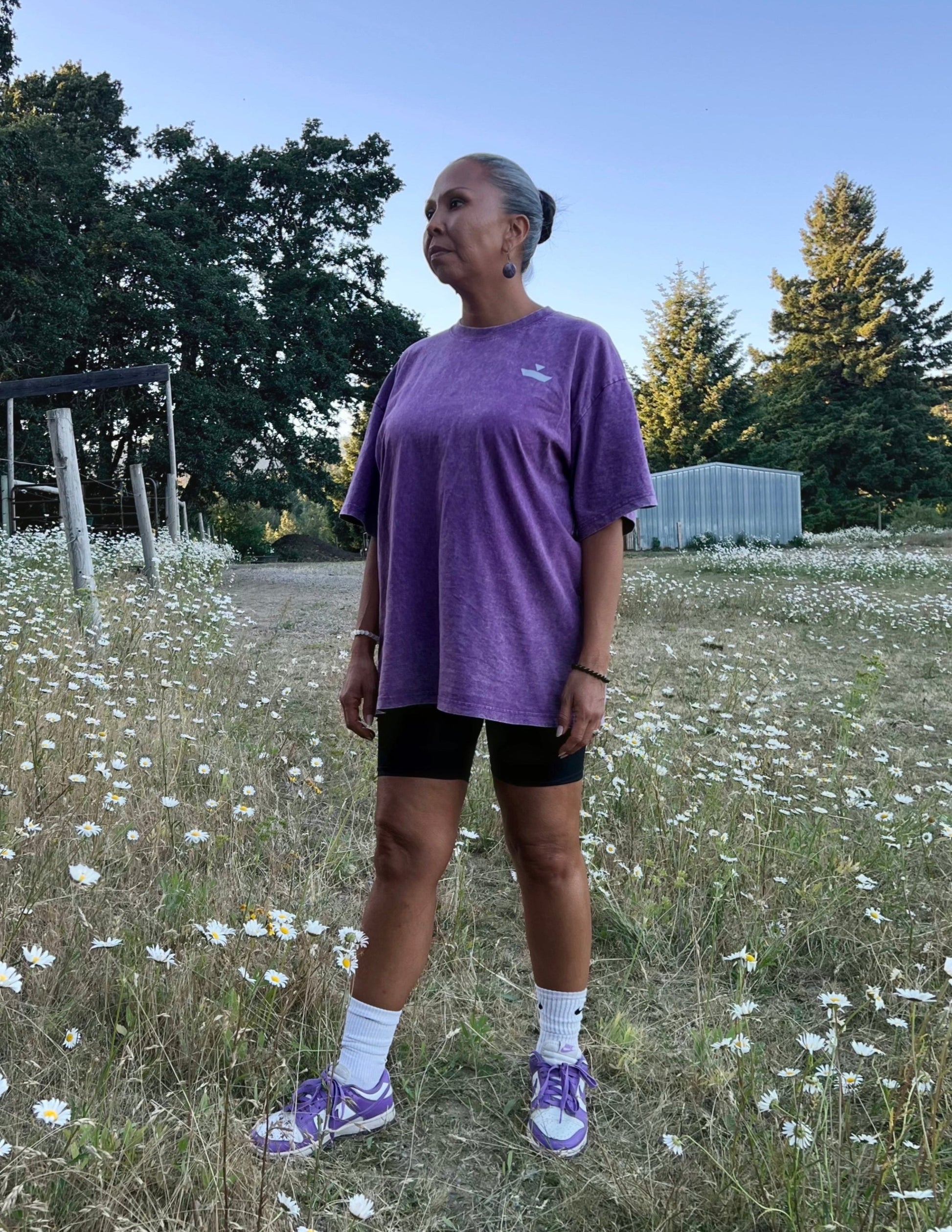 - *Live model photos are slightly more warm toned because of the sunset. The shirt is a more neutral purple similar to the mockups.