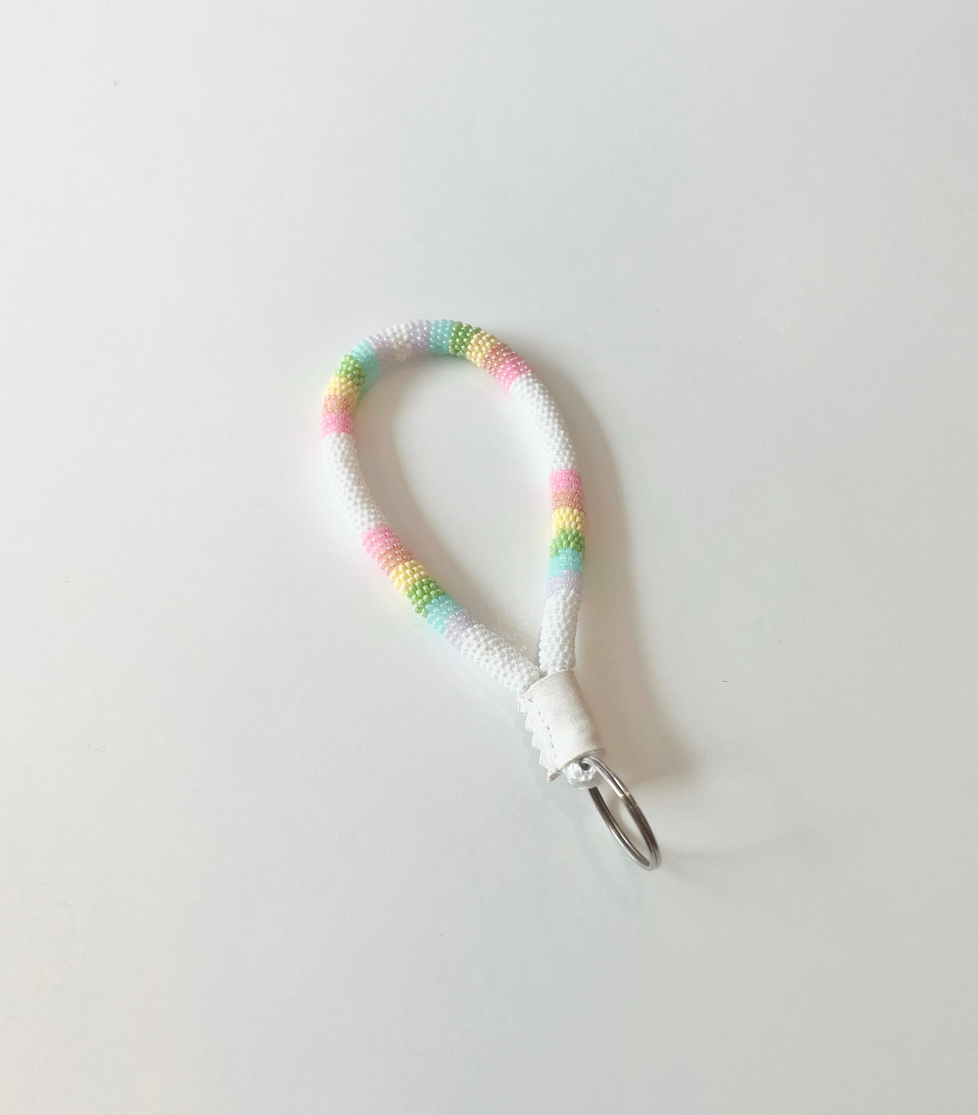 Beaded rainbow keychain with white leather and a key ring.
