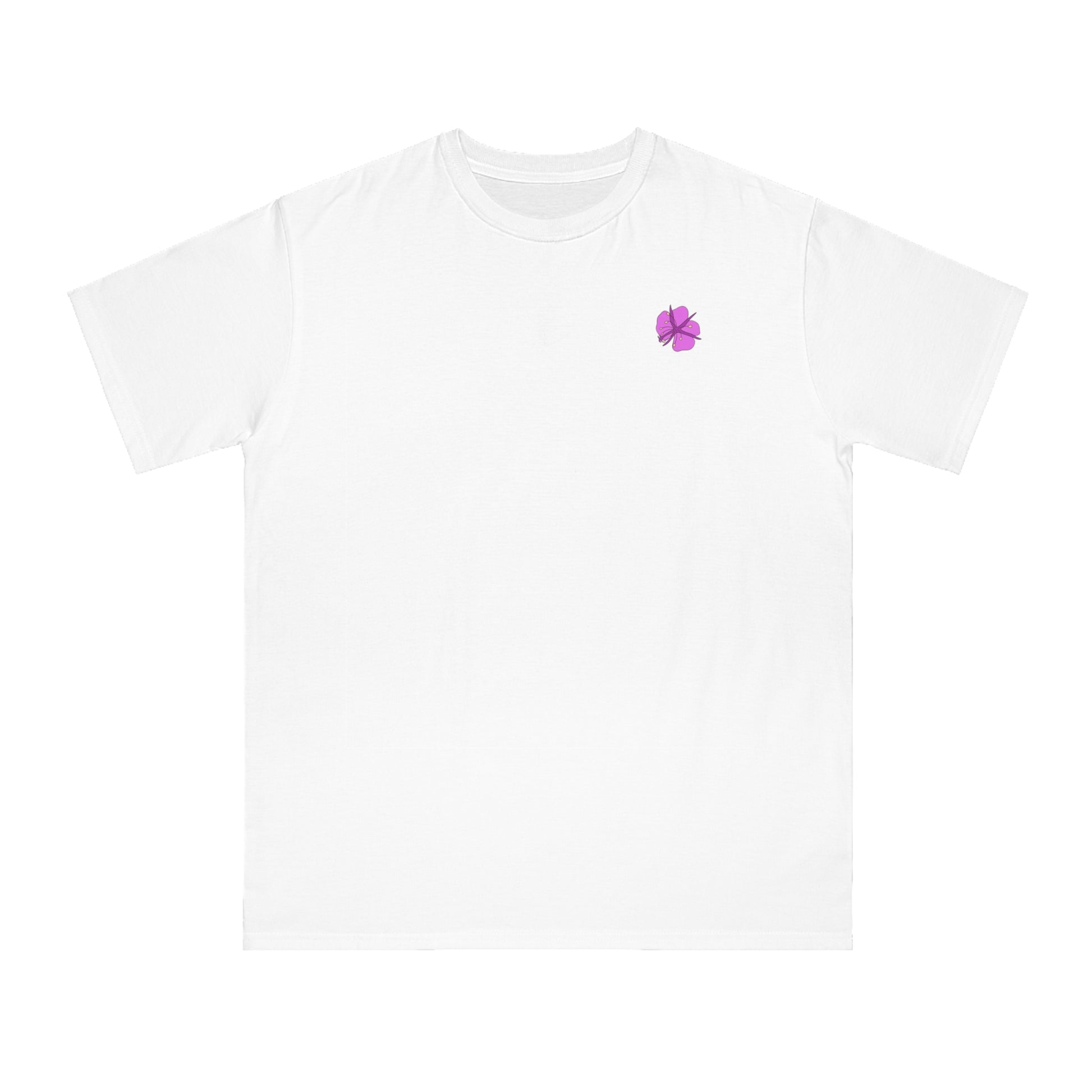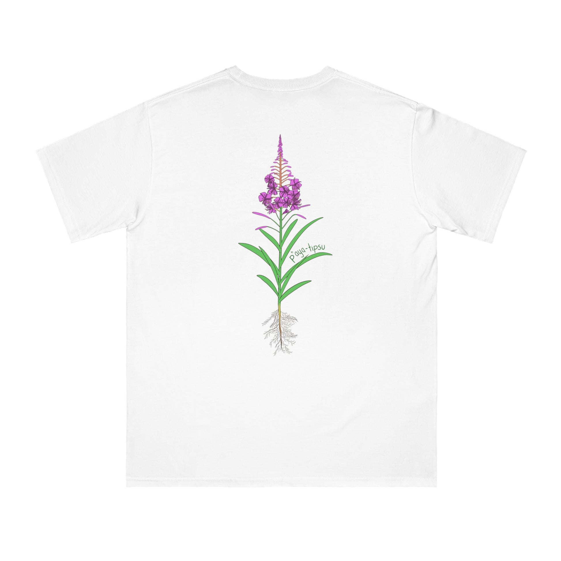 This shirt includes illustrations of pʰaya-tipsu (fireweed) a traditional plant. Indigenous people have used this for generations as a good source of mineral tea from leaves, its edible shoots and roots, nectar, raw stem for cuts, dried stems for weaving, to re-establish vegetation, and much more!