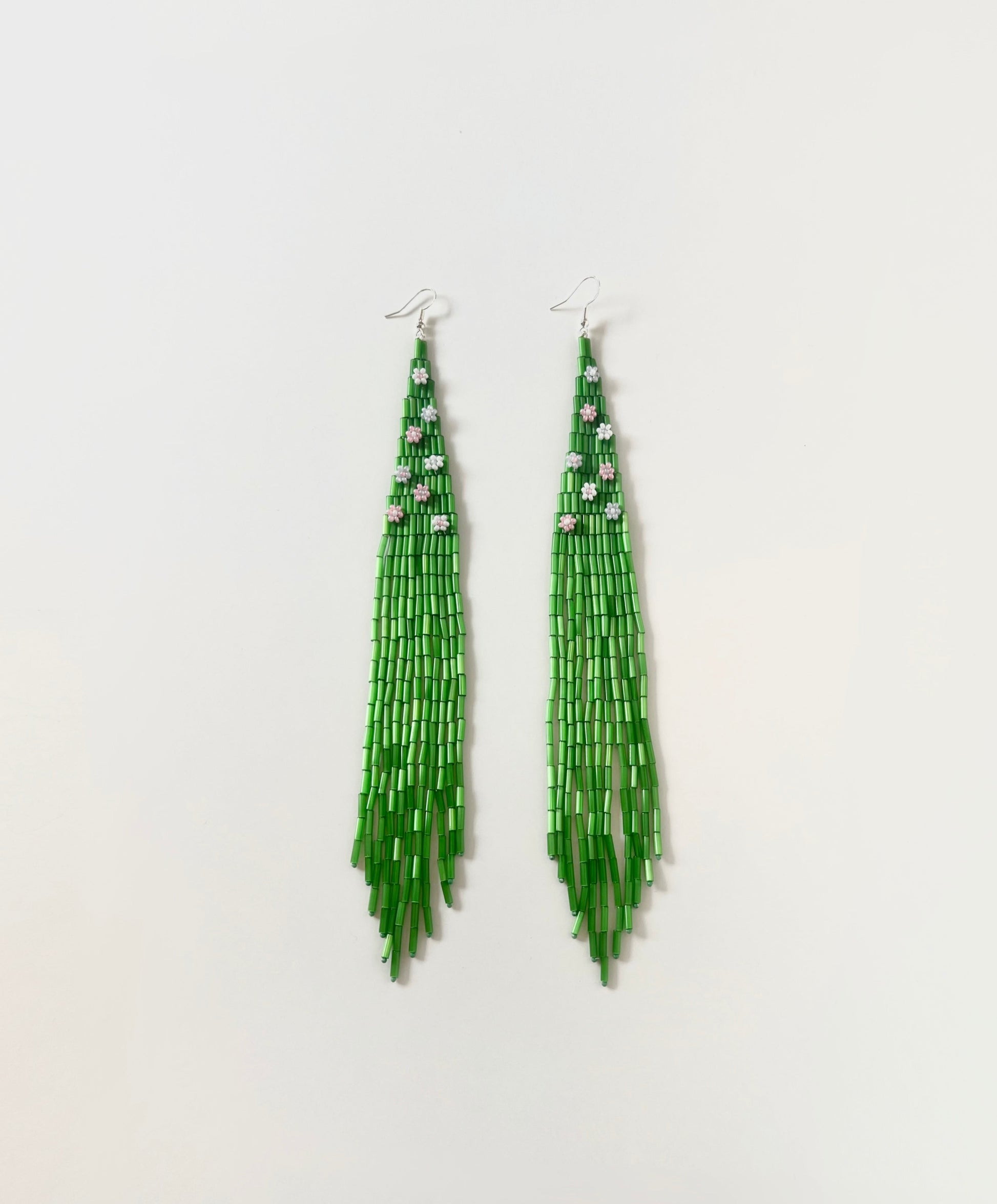 Green glass bugle beads and glass seed beads on 925 sterling silver hypoallergenic earring hooks.